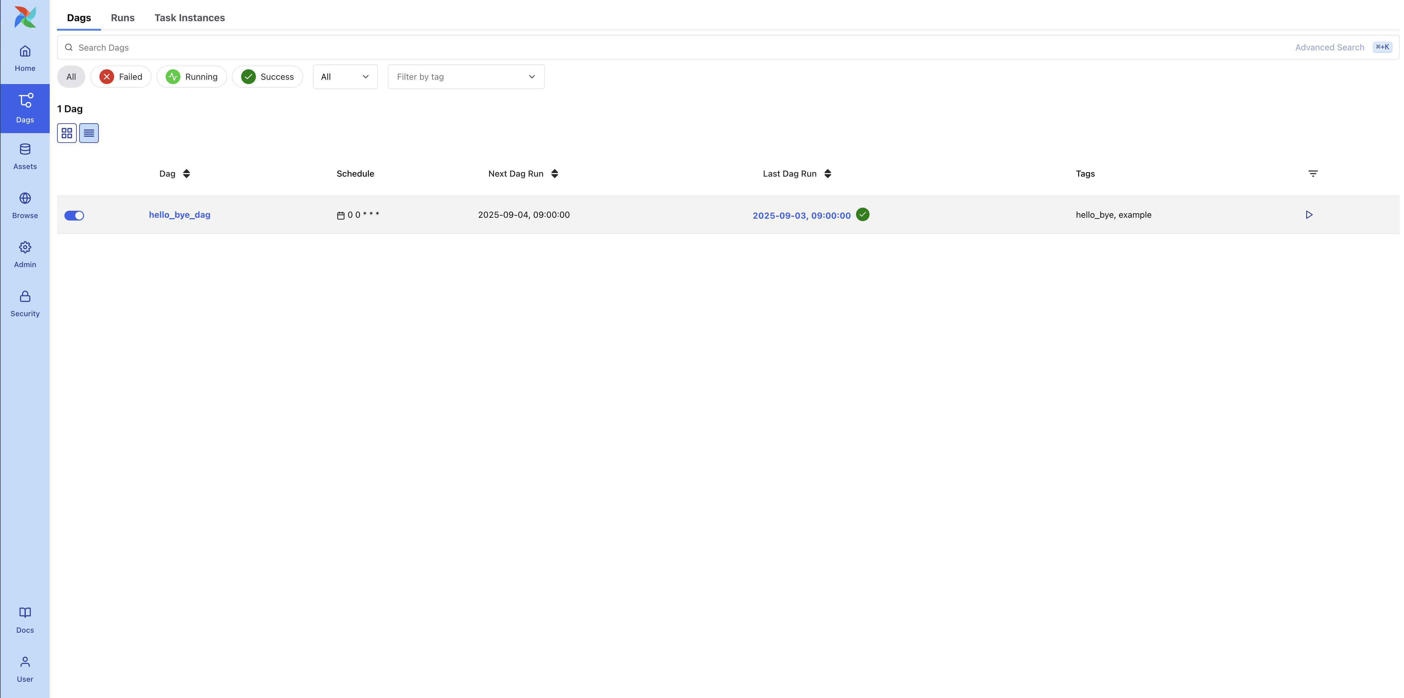 DAG 이름, Schedule, Tags 등의 정보를 확인할 수 있고 왼쪽의 버튼을 토글하면 DAG를 실행시킬 수 있다