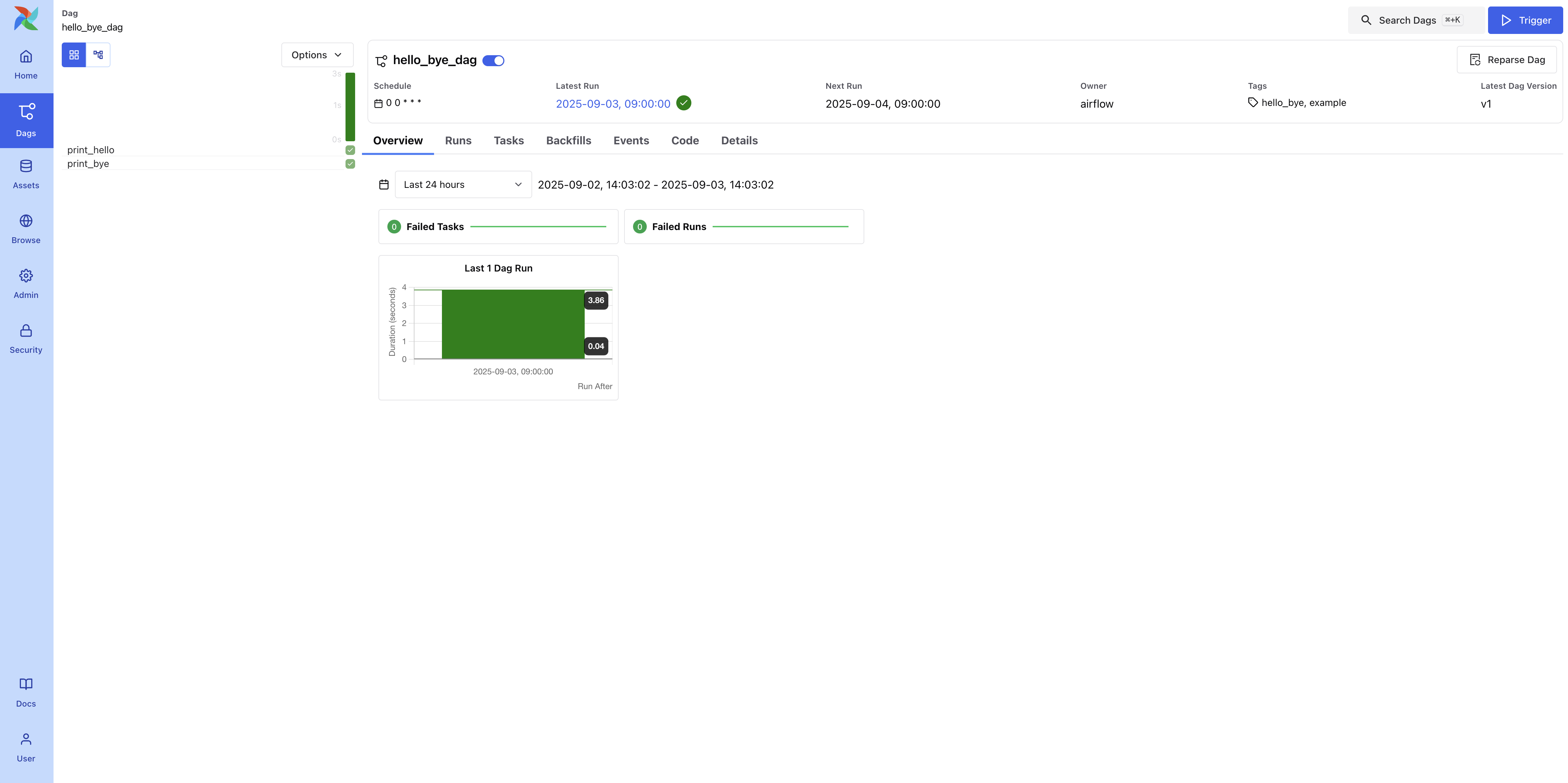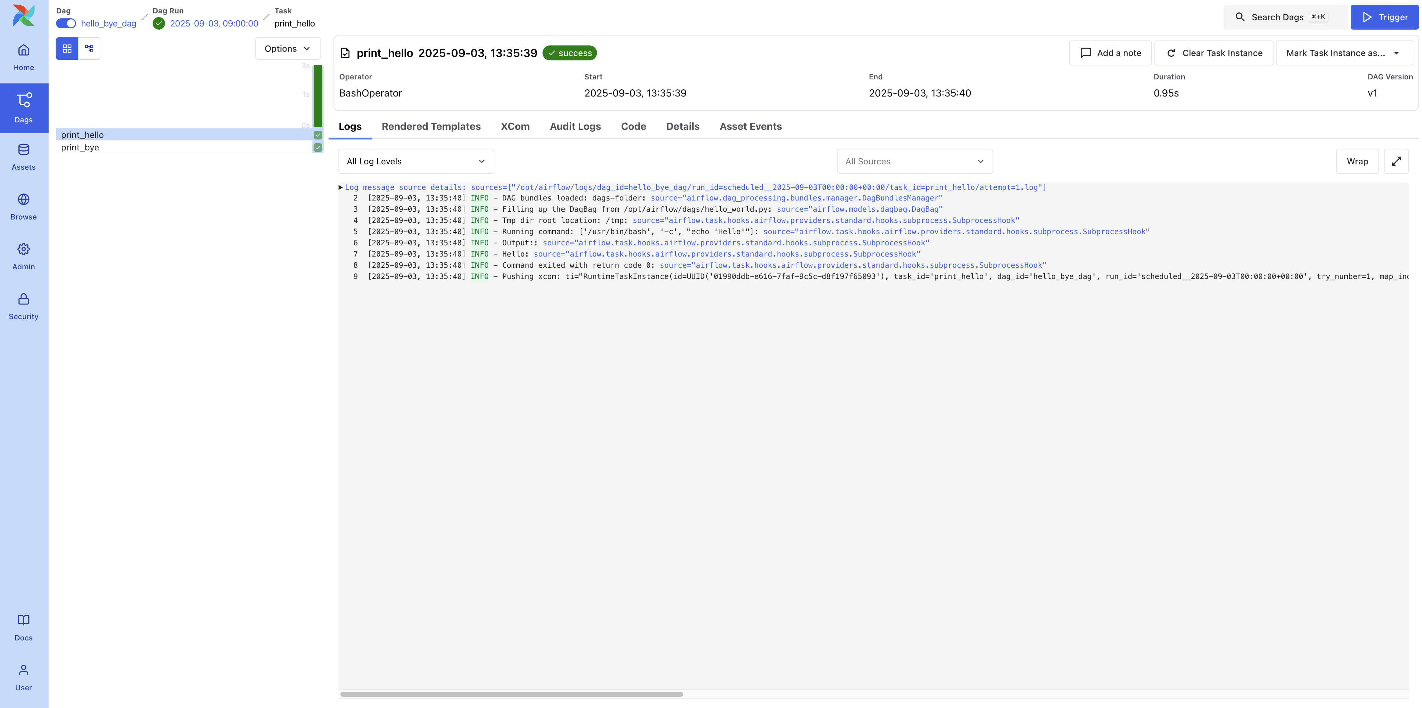 각 Task를 클릭하고 Log를 확인하면 Hello, Bye가 출력된 것을 볼 수 있다