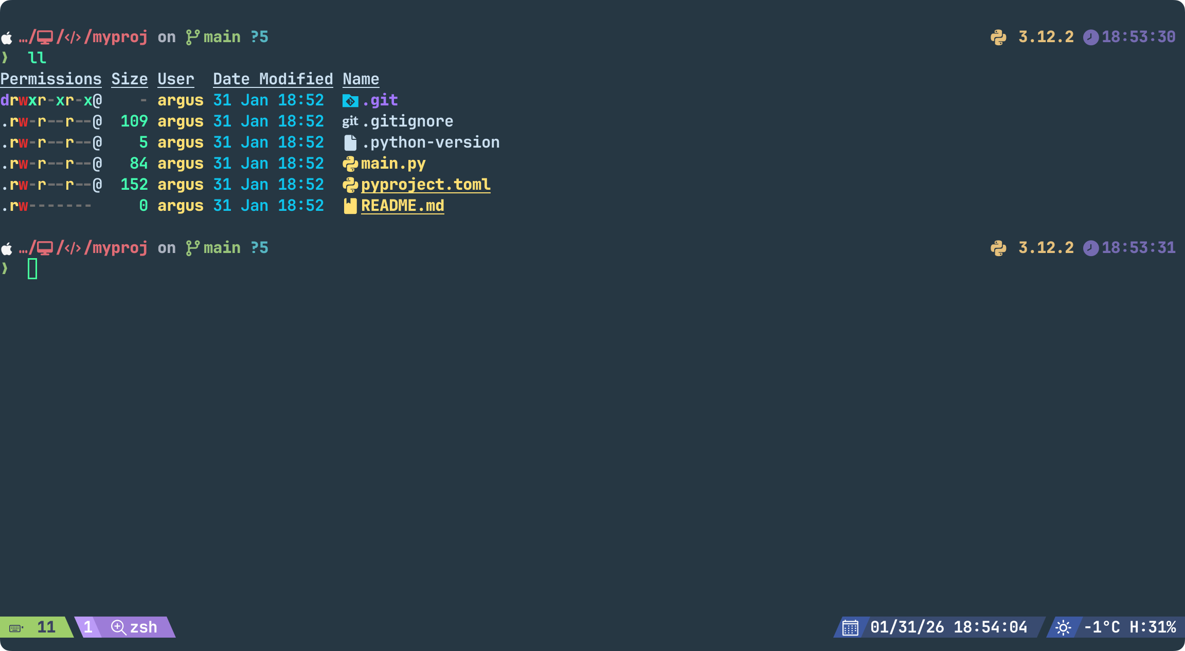 uv init myproj # myproj ํด๋ ๋ง๋ค๊ณ ๊ทธ ์์ ํ์ํ ๊ธฐ๋ณธ ํ์ผ ์์ฑ