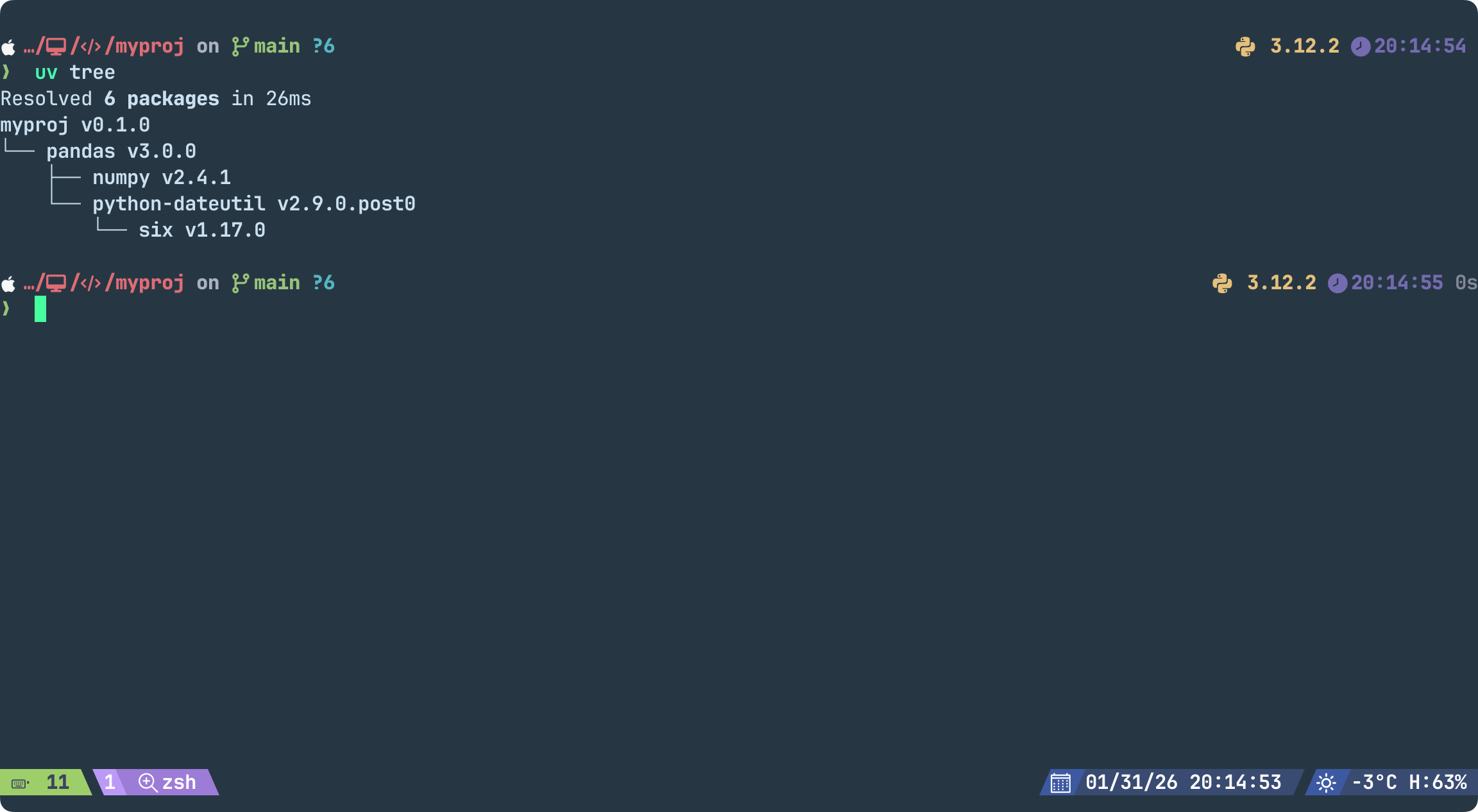 uv venv --prompt myproj # ๊ฐ์ํ๊ฒฝ ํ์ฑํํ๋ฉด ํ๋กฌํํธ๊ฐ (myproj)๋ก ๋ณด์