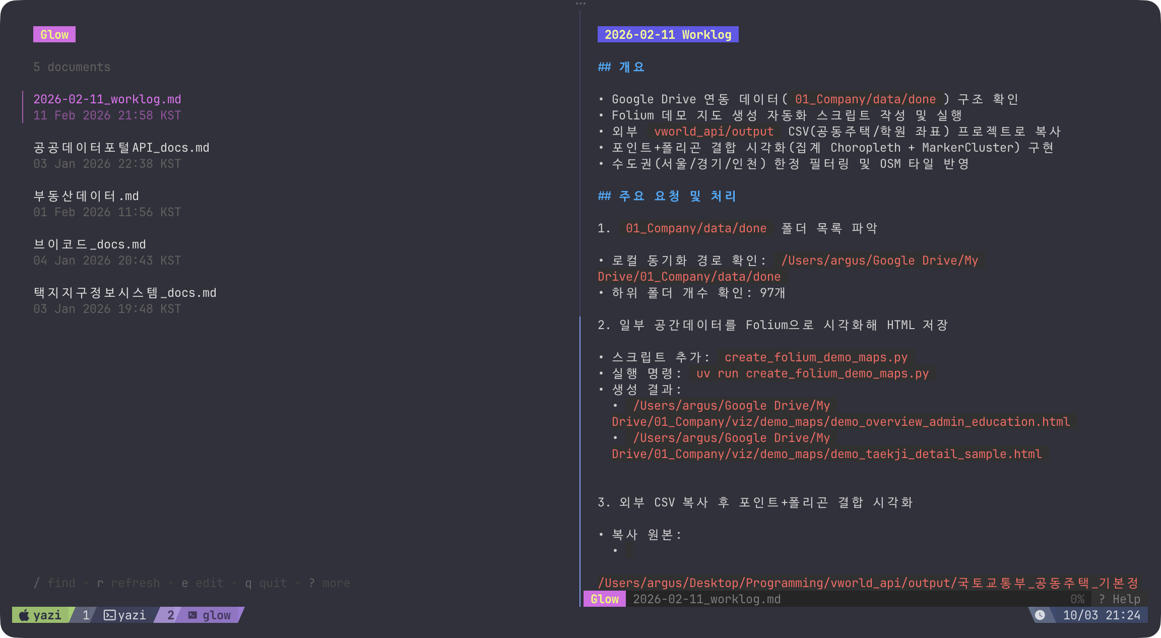• 바이브코딩할 때 가장 많이 보는 문서인 마크다운을 터미널에서 예쁘게 보기 (물론 neovim으로 봐도 됨)